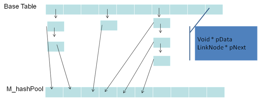Hash由基本索引表(Base Index Table,以下简称BIT)和一个用于分配Hash节点的内存池组成,基本索引表的长度表征了Hash的大小。在XHash中哈希桶是一个对象指针数组(XItemPtrArray<XItem, 2>),它是一个初始容量为2的对象指针数组,该数组可根据冲突的个数动态调整容量,由于该数组所占空间较小,它从XHash的内存池空间中分配。由Hash定位的数据需要提供一个函数(IdGetter)以获取唯一标识它的整型数,将此整型数对基本索引表的长度取模,得到的余数就是该数据在Hash中的索引。原则上该数据的地址存在基本索引表余数对应的位置上,如果有两个数据拥有相同的索引,则将该数据添加到对应哈希桶中。