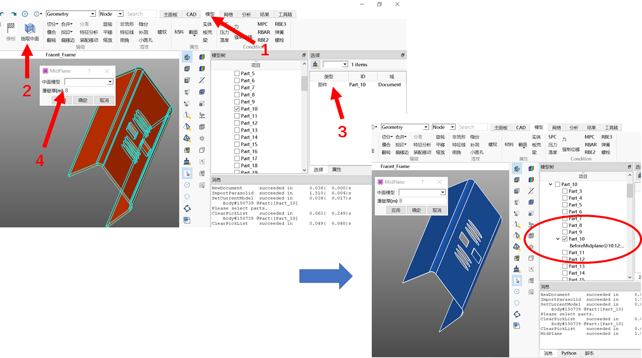 如下图所示,导入模型之后,切换到模型导航栏,点击抽取中面按钮,激活部件选择模式,选择对象部件,输入壁厚(可通过【工具箱>测量>距离】功能测量壁厚),点击确定,然后部件的中面即构建出来,它会替换原来的几何实体,原来的几何实体以快照形式保存到模型树中,用户可以根据需要恢复原有几何实体。