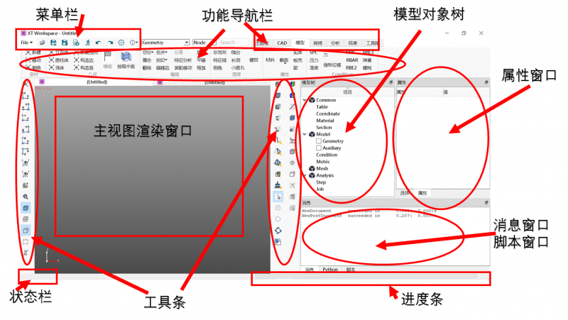XT是个可高度定制化的框架平台,它在Qt库下开发,默认的界面包含菜单栏、功能导航栏、渲染主窗口、工具条、模型树、属性窗口以及消息窗口、状态栏、进度条等子控件,如下图所示。