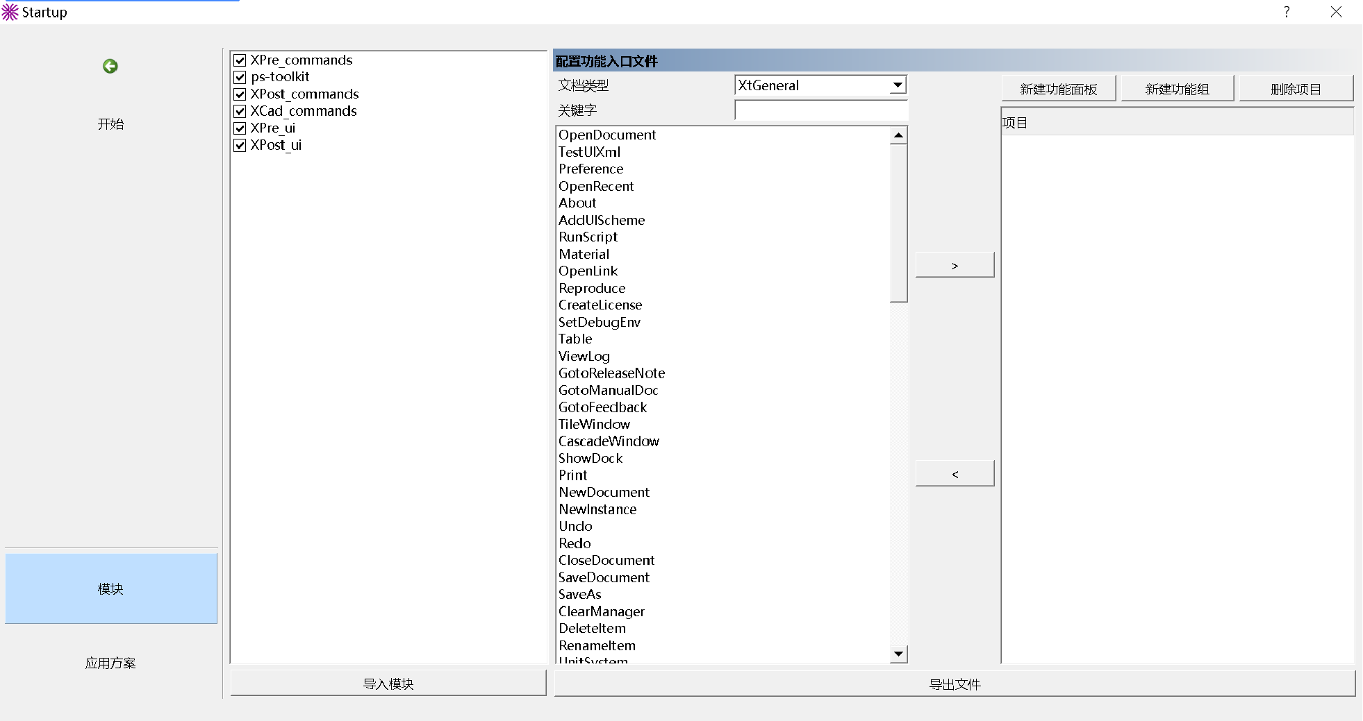 在模块导入后,模块中注册的文档会更新到上图中的文件类型下拉框中,支持该类型的全部命令(command)会列在下面列表框中,用户可切换文档类型或者输入关键字符串以搜索特定命令。用户可按照自己的设计点击右边的新建功能面板、新建功能组构建配置文件的框架(双击可修改名称),然后选择功能组,在命令列表中选择命令项,点击【>】按钮将功能加入到配置文件中。最后点击导出文件按钮将配置导出为xml文件,在后面新建应用方案时即可选择该文件。