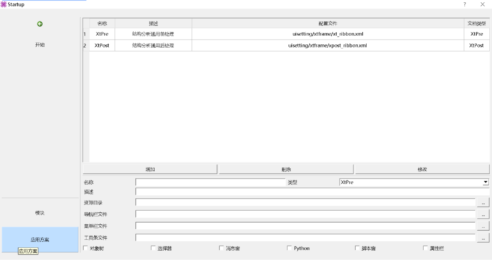 一个应用方案包含:方案名称、文档类型、资源目录、导航配置文件、标题栏配置文件、工具条配置文件、方案描述、默认导航面板序号以及通用控件配置。其中: